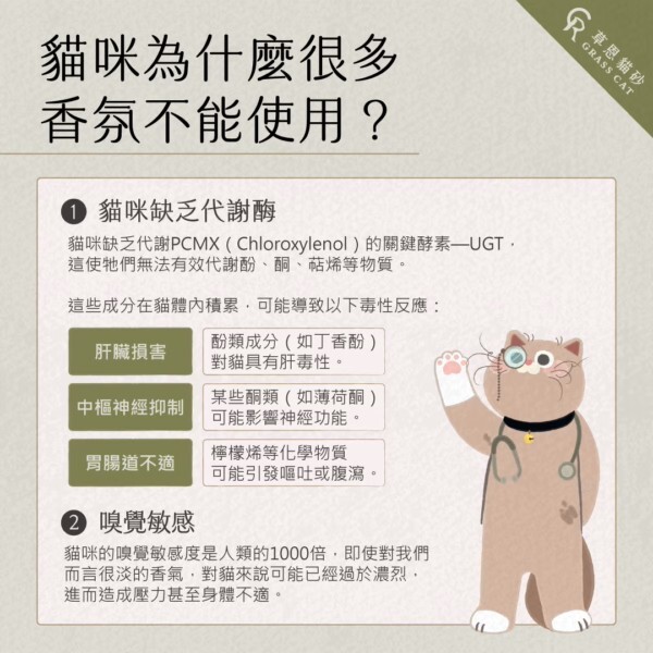 貓咪缺乏代謝PCMX(Chloroxylenol)的關鍵酵素—UGT,這使牠們無法有效代謝酚、酮、萜烯等物質。
