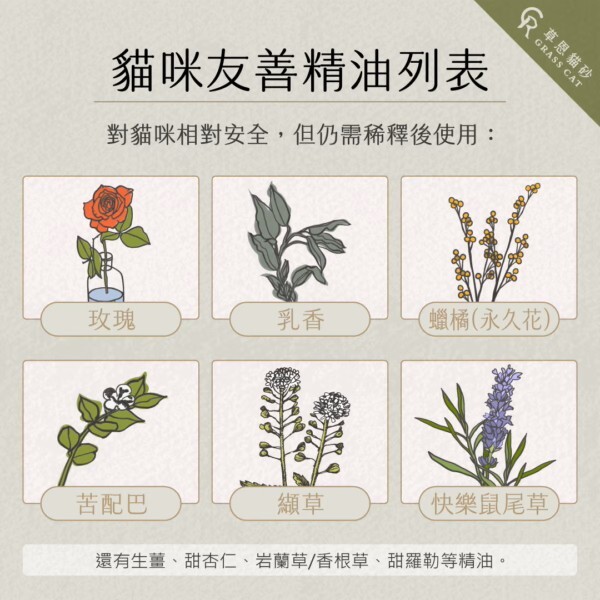 以下精油對貓咪相對安全,但仍需稀釋後使用: