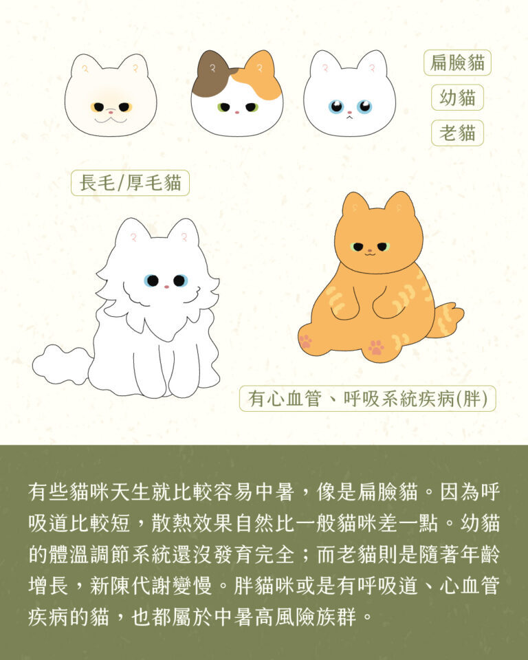 另外,幼貓跟老貓也要特別注意。幼貓的體溫調節系統還沒發育完全;而老貓則是隨著年齡增長,新陳代謝變慢,散熱的效率也會跟著降低。還有,胖貓咪或是有呼吸道、心血管疾病的貓,也都屬於中暑高風險族群。因為肥胖會壓迫到呼吸系統,加上疾病本身可能就已經影響到心肺功能,散熱過程就會變得更加吃力。