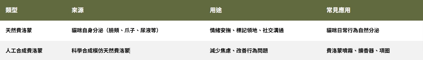 費洛蒙主要分為天然費洛蒙和人工合成費洛蒙。前者是貓咪自己分泌的,後者則是人類模仿這些氣味製作出來的,常見於各種幫助貓咪安撫情緒的產品。