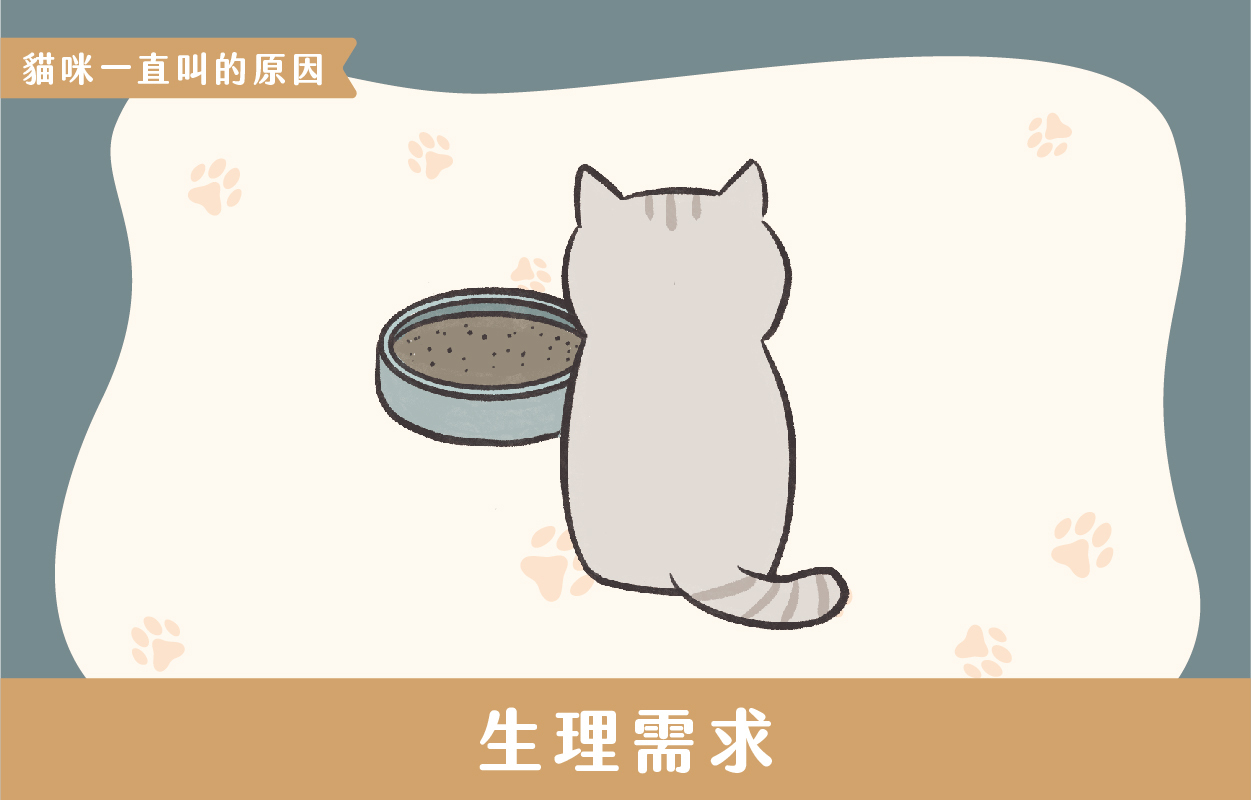 貓咪有時候會因為生理需求而不斷叫喊,例如當貓咪需要上廁所時,他們會在門口叫喊或用異常的叫聲引起主人的注意。由於貓咪是非常愛乾淨的動物,他們會避免在自己的生活空間中排泄,因此他們會試圖告訴我們他們需要使用砂盆。